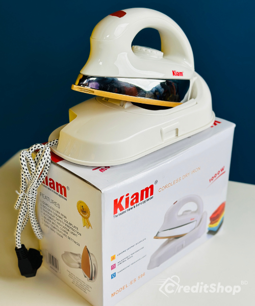 Kiam ES596 1000W Cordless Electric Dry Iron Price In Bangladesh 1000w Model: es596 CERAMIC COATING SOLEPLATE ADJUSTABLE TEMPERATURE CONTROL KNOB. THERMOSTAT INDICATOR LIGHT.